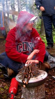 Despite the soggy woods, the students manage to get small fires build on top of their baking pans (which are sitting atop their stoves) and the prospects for well-baked rolls are looking very good. The required baking time passes and I eagerly await the unveiling. The lids of the frybakes are pried off and golden brown delights are revealed. Wahoo! A peak.