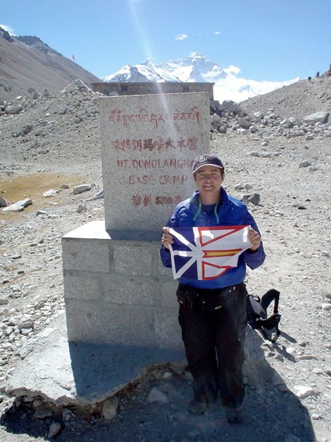 Two more 5,000 metre climbs delivered a magnificent view. As I rounded the last punishing corner, the north face of Mount Everest was abruptly revealed. Despite the challenge of getting my bike moving again at that elevation, I stopped and stared at the massive mountain. Different from the view of Everest in Nepal, here it was easy to grasp its magnificent stature. We camped at the Rongbuk Monastery and I often stared at Everest. The next day we watched a climbing expedition make their way towards base camp. We followed in a cart pulled by a high altitude pony. Arriving an hour later at base camp, I had an inkling that my inner voice was getting ready to speak. Despite it appearing as an impossible task to me, I began to contemplate climbing Everest. To seal the moment in my memory, I had a friend take a picture of me at base camp holding the Newfoundland flag. I nurtured a tentative thought: “This might be what I came to Tibet to find.”