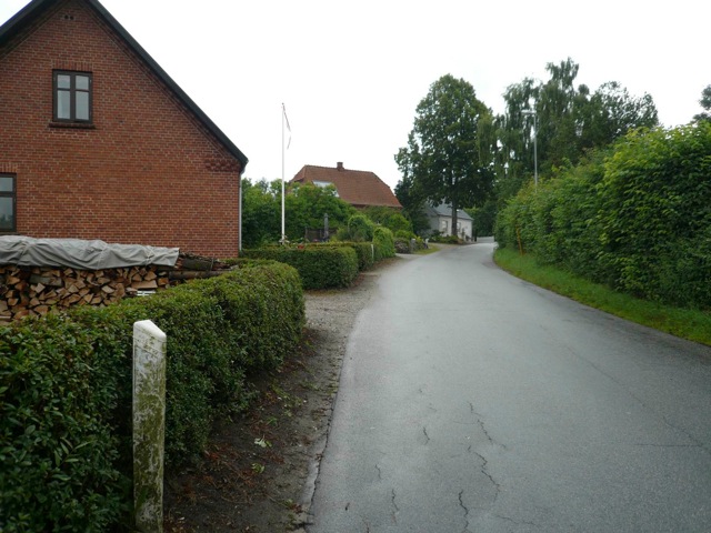 I found the 107 bus stop and got the piece of paper out on which I’d written the destination for the bus driver, Tebstrup. He said 20 Kroner (since I had no clue how to pronounce Tebstrup they was no danger in being taken for a Dane.) I knew it would take approximately 14 minutes to get there and tried to follow along on the list of stops I’d copied down. Gotta love those street and town signs and soon I was stepping off the bus knowing I was a 4 kilometer trek from my mountain. My rejseplanen has several jigs and jaws in town before hitting the main road that I was to hike along but fortunately, I walked half a block and spotted a turn right to Ejer Bavnehoj sign, perhaps the navigation wouldn’t be too hard after all. The climb was gradual, probably better described as pastoral as the road/bikeway wove gently up towards Ris. Senses all set to record, I took in small rural village life in Denmark. Wheat fields in shades of olive and mustard drew my eye. I was reminded of the joy of coming into a village on the trek to Everest base camp and entering Ris felt the same way.