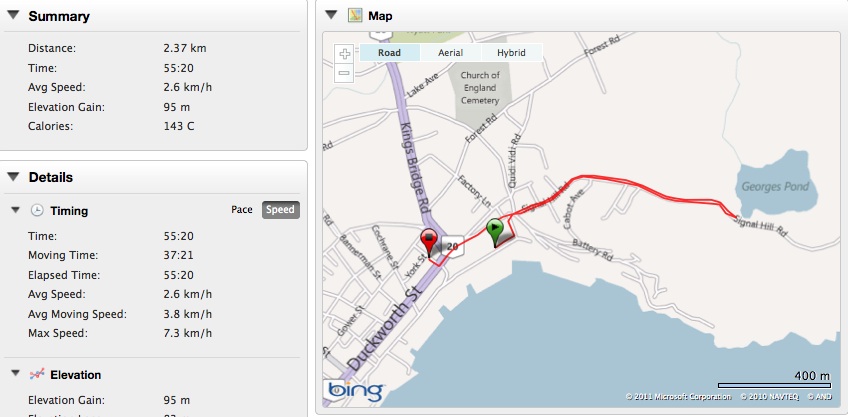 What a difference a week makes…Today’s tire pull was entirely easier (forgive the pun). Instead of needing to stop for exploding calves, it was my max heart rate that called for pause. I can already see and feel progress of the first big week of training. Sweat was pouring off my face as I pulled a “3/4”, (to the visitor’s centre on Signal Hill). It was a total distance of 2.3 kilometres and 93 metres of elevation gain. Thanks to Natelle and Toby who came out this morning to keep me company (and make sure I got out of bed). Later today, I’ll tackle my second set of sand bag get ups et al. Soon, I’ll also put my attention on gear and rope practice with huge mitts on.