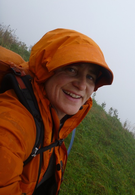 Maybe I should caption this one, “The Great Pumpkin.” Rather than a giant squash however, it’s me nearing the end of a 20 km training hike pretty darn soggy from a stormy day. It rained and showered much of the time I was out hiking from Outer Cover to town via the East Coast Trail and Signal Hill. When I first started out, I thought, “Wow…this 35 pounds doesn’t feel so bad-more like 20 used to feel.” By the time I was hobbling down Signal Hill as my last kilometre, I knew I had shlepped a load and my feet were complaining loudly since they spent a decent part of the day hiking on asphalt between trail segments.