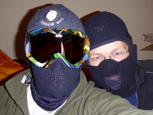 It was great to have company and another brain to run gear decisions by. Marian helps me to not take too little (as would be my default) or too much. She also helped fix some stuff and she wields a sewing needle with great skill. I must have tied 20 zipper pulls onto various zippers (where do they go?). Zipper pulls help out a bunch when one is wearing big gloves or mitts. Here we are trying various balaclava options/face mask options out…Already I know I’m going to miss Marian so much while on the ice and wish I could sneak her into my duffel bag. It might be a bit hard to get the bag through all the airports/flights as I’m only allowed one 50 pound bag (excess baggage costs $30 per pound!!!)