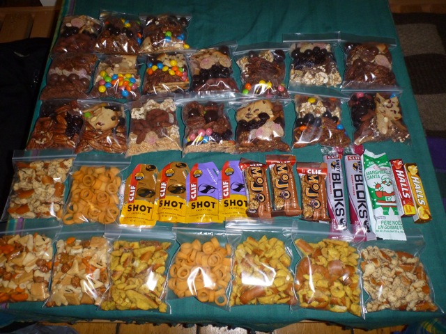 Once the items were in the bowls, it was time to make up 17 different mixes of items-one for each lunch. One thing I’ve learned about mountain food is that I like variety. Each bag had one of the nut items, some form of chocolate, and some sour in various amounts. On Denali, after 32 days of snack food for lunches, I grew pretty tired of having the snack bag look the same every day so here I aimed to have lots of choice to fill various cravings. Each bad weighs 155 grams and it’s one per day.
