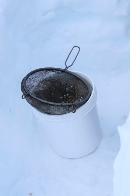 At Vinson Base Camp, feces and urine are separately as well (can be quite a challenge sometimes for those of us of the female persuasion). Feces are collected in special containers (seen above) for transportation back to Chile. Urine is dumped into a single augered hole at each camp. At base camp, we women had the convenience of using a big pee bucket rather than our pee bottles.