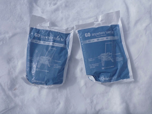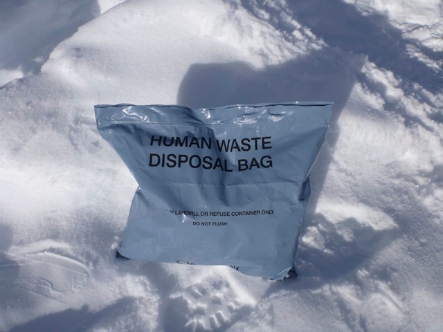 Above base camp, climbers must collect their feces in a “wag bag”. These handy kits contain a capture bag that has some cool powder that turns liquid solid and then an outer ziplock for overall storage. Each kit also has a handy wipe and a bit of TP.