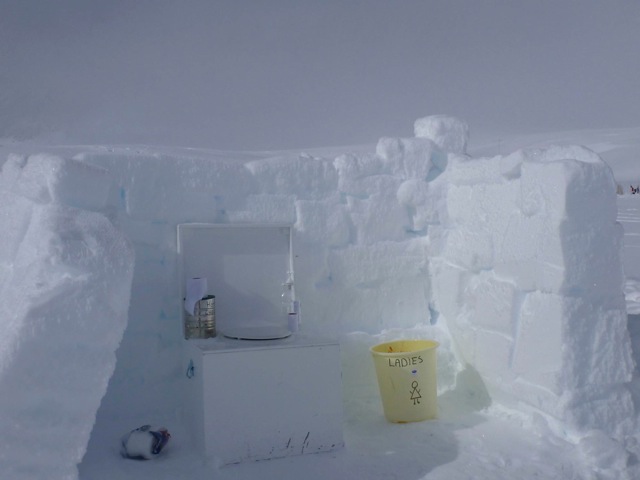 Between camps, one has to do a fancy “hold the wag bag up to your bottom to catch” manoeuvre. A both low and high camp, small buckets with toilet seats make the move much easier (and the snow walls afford a wee bit of privacy from the others sharing camp).