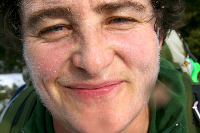 Now if you ask any of the students in my winter outdoor education course, they will tell you that one of my favourite course mantras is “sweat is evil.” With the increase in temps today, the only way I could have kept from sweating while pulling such a load would have been to do it in shorts and a t-shirt (synthetic, of course). Marian loved this picture of me that she took while we were on a short break because some of my sweat has condensed on my facial hair.