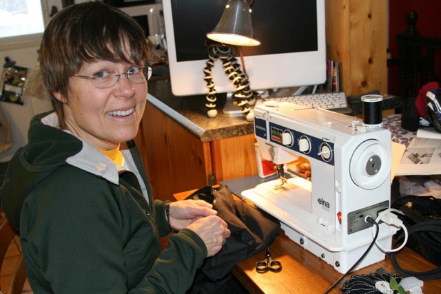 Here my “Hero of the Sewing Machine” is installing side zips in my lightweight nylon wind pants. They came with only an eight inch boot zipper but three-quarter length zips are much more convenient for venting as well as putting on and taking off the pants, so it’s pretty cool that Marian can improve on MEC’s design.