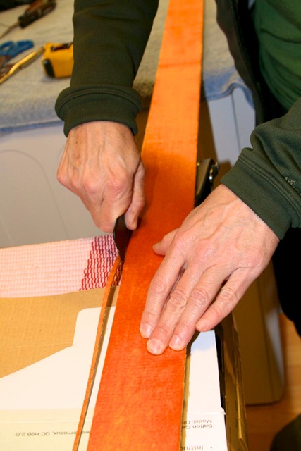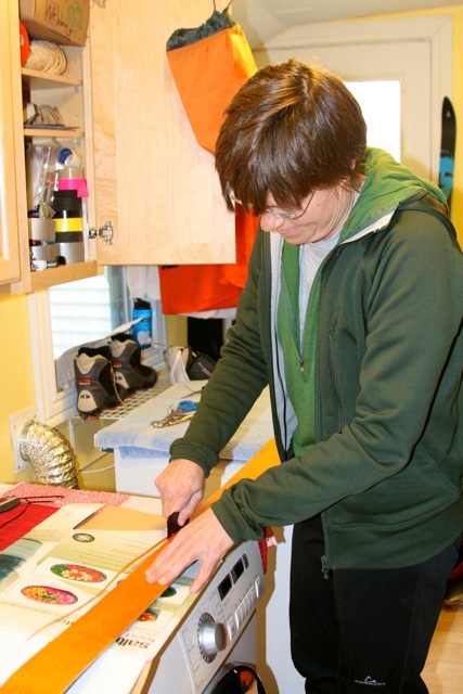 Sometimes a holiday is positioned right where you need one…and today’s was no exception. I can’t remember a day in recent history (i.e. the last decade :-)) when I spent the entire day at home. I only left the house to go out to the car to get something. Marian was home all day as well and it meant we made great headway on several expedition tasks. We started the day tackling my climbing skins. Climbing skins adhere to the bottom of your skins allowing you to climb hills without sliding back down. As I’m using nordic touring gear, it’s hard to get a pair of skins narrow enough for my skis so we had to trim them down. In the pictures above and below, Marian is using the special trim tool to cut the skin to side and expose the ski edge.