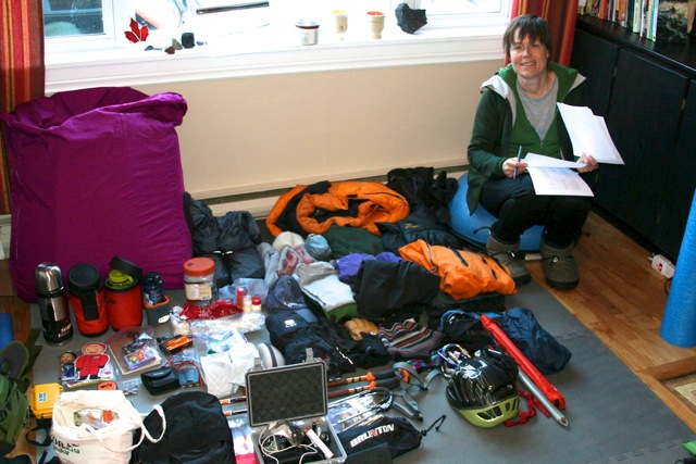 Over the past few weeks, I’ve been moving gear down into the living room a.k.a. expedition staging area and putting them in a pile on the couch. Today we did a second pass through the gear list with me showing each gear and clothing choice to Marian for approval and for checking off of the list. I suspect, left to my own devices, I might pack a wee bit light…then again, light is right when it comes to expedition packing. In the picture below, you can see how the process transformed the amorphous pile of gear into well organized categories that are ready to go into zip bags. All the electronics are charged and the good news was it was sunny enough to test the solar charging system and the really good news is that it worked to charge the sat phone! Zipper pulls got installed along with a pocket on my wind pants. I checked out the long hours of daylight we can expect at 70 degrees North and we’ve got the last of the shopping/small bits to buy tomorrow in between the two holidays!