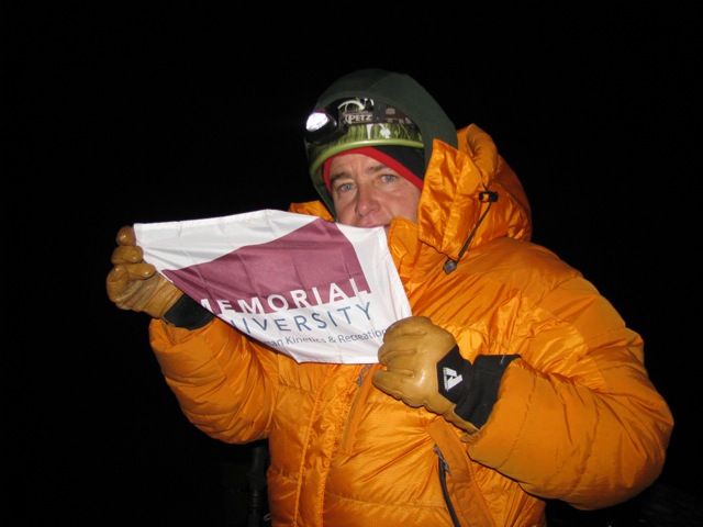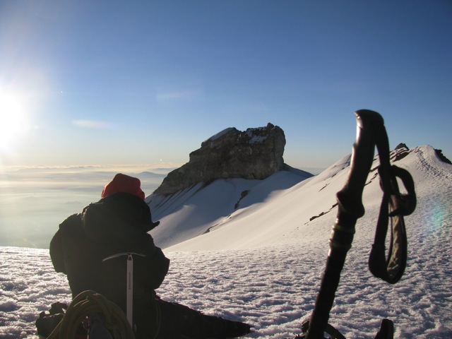 The “wake-up” call came at 1:00 am. We choked down some oatmeal and coffee and starting climbing around 2:45 am. The first stretch was a rocky gully with mid sized talus and scree. At the top of this we reached the glacier and roped up. For the first time on the trip, I found my rhythm. The combination of climbing on snow, in the dark, and on a rope team provided blessed relief to the challenge. I love climbing in the dark. It takes away so many distractions and provides intense focus on the task at hand. It also hides the slope and provides the great sense of surprise at what yo’ve just climbed over when the sun finally rises. The night started warm but the higher we climbed, the more the wind picked up and by the summit I was climbing in all the clothes I had brought including my down parka. It was a cold one-I’m rarely that cold-even when I was in Antarctica…go figure.