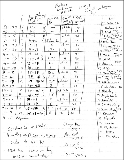 Starting to map out the training plan for my spring climbs of Mera peak, Island Peak, and Mount Logan. It’s good to have it take shape and it starts right now this week. Logan has a 10-15 hour summit day with a long distance of 13 kilometres of distance to cover at high altitude so I’m aiming high with the training. I’ll detail more of it in the next while but wanted to share the “napkin” version.