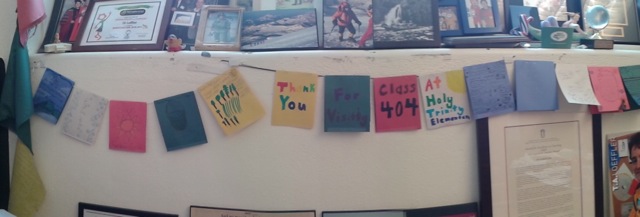 My office has new decorations thanks to the Grade Four students at Holy Trinity School in Torbay. I presented the challenges and rewards of being an explorer to some of the Grade Four classes there. They listened attentively and then had dozens of questions ranging from my favourite mountain to the hardest mountain to the kinds of wildlife I have seen. They sent me home with wonderful strings of prayer flags the students had made. Each flag is decorated representatively of the element its colour represents (i.e. fire, water, air, earth, sky) and with a good wish for my climb of Mount Logan.