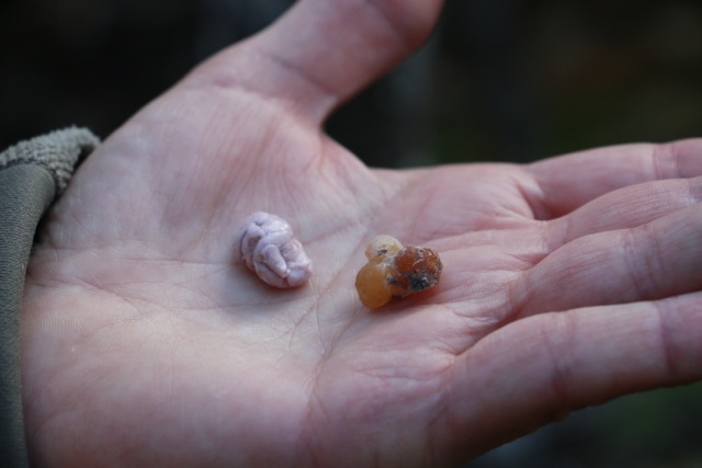 We collected some spruce “gum”…we’d learned recently that you know spruce resin is mature enough to chew when it turns pink when you chew it. As you can see, ours was aged enough to be great gum (though we now know that it does stick to dental work…quite well).