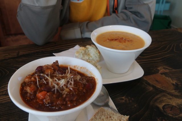 We made ourselves comfy in the sun-drenched cafe and ordered chili, roasted root veggie soup, peanut butter cheesecake and cappuccinos.