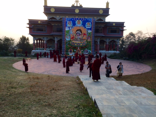 Mingmar, Marian and I stretched our legs hiking around Kopan. We visited two of the many monasteries there. We happened by two pujas (blessing ceremony) that were clearing obstacles in the lead up to Losar, the Tibetan New Year. The monks were wearing their ceremonial yellow hats and traditional costumes. There was chanting, drumming, and blowing of the deep six foot horns. We managed to accumulate 22,282 steps throughout the day.
