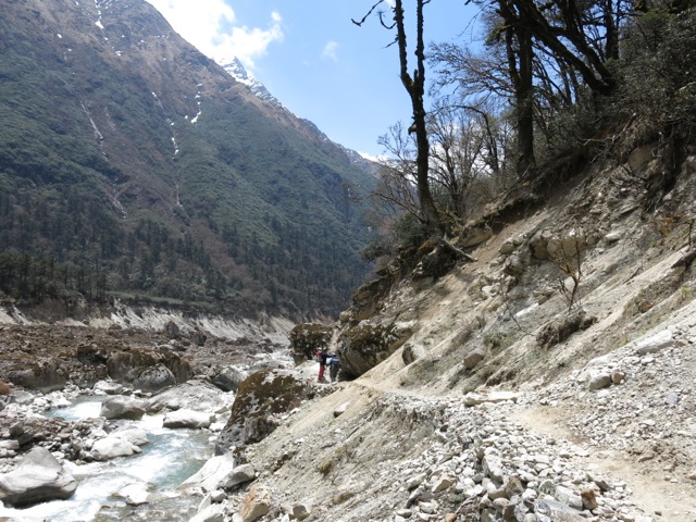 Commence Sanku link of the GHT from Olangchun Gola to Pass Camp (4453m). The Great Himalaya Trail crosses the rugged wilderness of the Lumbha Sambha to the Makalu region. From Olangchun Gola we head in a northerly direction, crossing the Tamor Khola and travelling up the Dingsamba Khola. The trail then ascends through rhododendron forest to a valley and then another smaller valley beyond gained by climbing over a rock band.