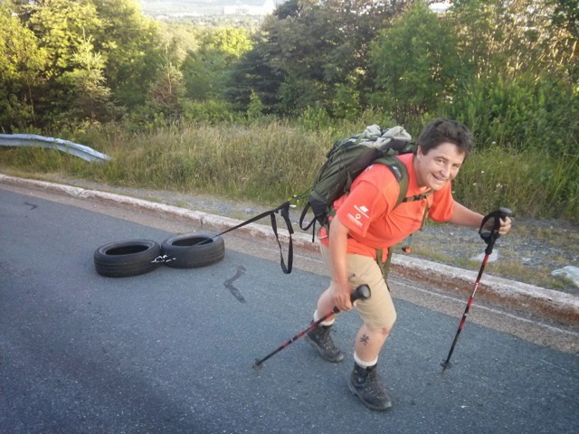 Here’s a look at my new tire pulling rig. Thanks to Marian for coming along and taking this picture. This week my pack weight was up by 8 pounds and I managed the two tires side by side much of the way up Signal Hill. The cool morning made the pull a wee bit easier, though overall, the increase in pack weight made it all seem harder than week one. I’m getting back into the swing of training and managed my first day back in the gym without too much soreness in the following 48 hours.