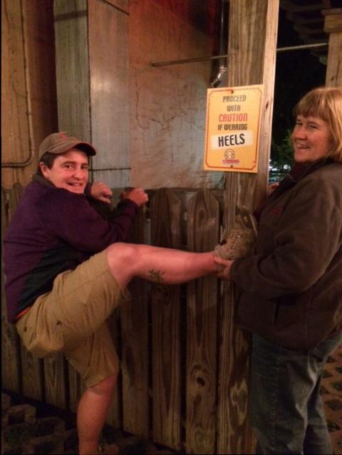 In the picture above, my leg is being held up by my best buddy, Karen Warren in a restaurant in Chattanooga, TN. We both loved the sign and the idea of me wearing heels. You can see my tattoo. It means courage. Karen have the Kurt Hahn address to the Association of Experiential Education last Friday and it that presentation, she said we need to exercise ordinary courage in pursuit of social justice. I agree and extend that idea that we need to practice ordinary courage in most everything we do especially in dealing with our own minds. My Buddhist teacher, Moh defines discipline as gentle bravery. While working with my mind yesterday, I thought of combining the two into gentle bravery/ordinary courage…meaning to me that in each moment, aiming to be both gentle and courageous, brave and ordinary…as well as courageously brave and ordinarily gentle…as well as bravely gentle and courageously ordinary…let those roll around in your head some, I am…and it’s helping.