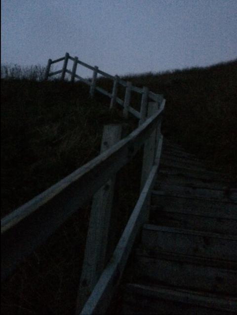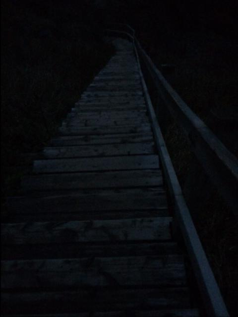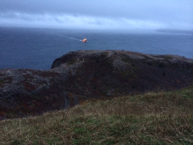 Both times I couldn’t get the camera out fast enough to capture the fox so you’re stuck with dark, dreary, and grainy pictures for today. I did see this off-shore oil fields ship coming in just as the rain broke. Though tough to see, the hanging clouds were pretty cool. The good news is that I was able to do two extra sets of stairs this morning in the same time frame as my last go…always good to see evidence that this training stuff works. The real test, of course, will come in about two weeks when I first set out to carry a load to Camp One on Ama Dablam. Eight more sleeps at home…