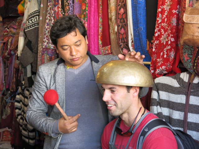 Another memory is of the Tibetan chanting and singing bowls you hear played from various shops. Here, Matt is being introduced to Singing Bowl medicine with the shopkeeper giving him a vibration treatment. We said the singing bowl might make an fine climbing helmet.