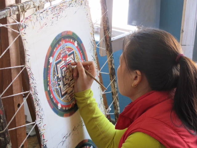 When visiting Boudhanath Stupa, there are several thanka painting schools. We visited one this morning to see the artists at work. The woman below is painting a kalachankra mandala thanka. It will take nearly 30 days to complete.