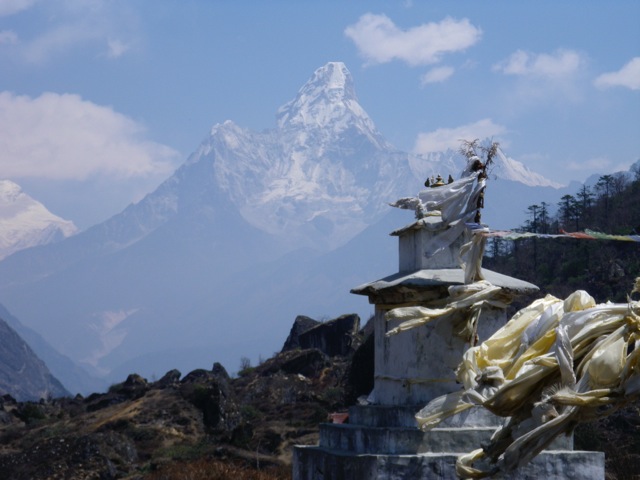 Today we drop all the way down to the Dudh Kosi to the village of Phunki Tenga, before making our way steadily back up to Tengboche where we stop for lunch. After visiting the monastery and looking around the visitor centre, we drop down through the beautiful Rhododendron Forest to Deboche. A little further on we cross the Dudh Kosi again and continue along to Pangboche. We stay at the Sonam Lodge Teahouse which is run by Germin Sherpa. Germin has summitted Everest a number of times as well as Cho Oyu and Ama Dablam. Another awesome family for us to stay with. It is the closest tea house to our mountain and Ama Dablam dominates the dining room window. In the evening, we’ll have a chat about Acute Mountain Sickness as well as other altitude related issues.
