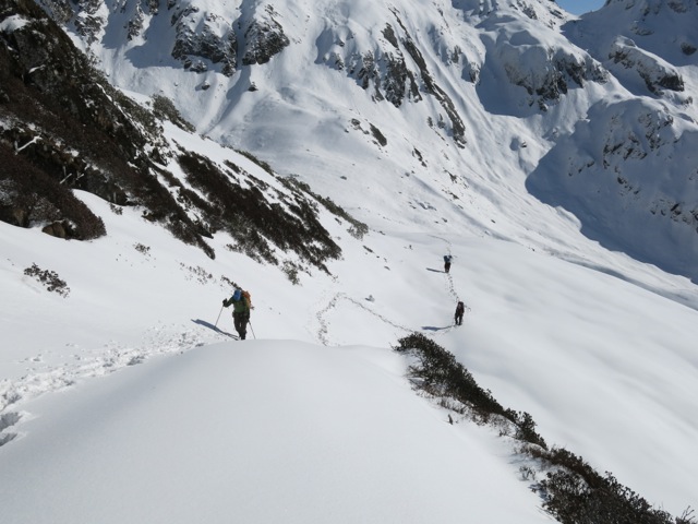 After our final preparations for our first foray up the hill, we will have an early lunch at Base Camp. We start along the easy trail and then gradually gain height along the ridge as we pass the old airfield at Mingbo. There are a couple of steeper sections that will get the lungs going, and then the angle eases off for the final 30 minutes to Advance Base Camp, which is sited on some flat platforms created at around 5,350m.