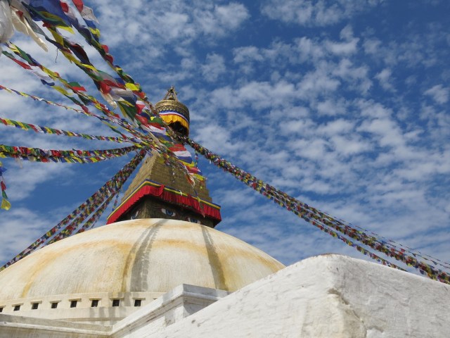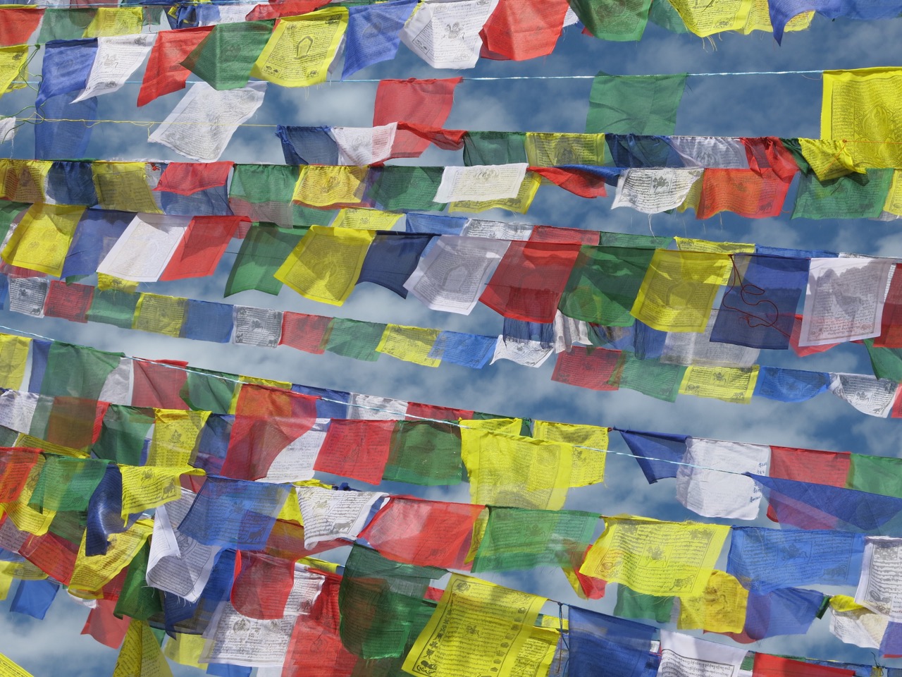 Prayer flags are raised in Tibet and Nepal after puja (blessing) ceremonies. They fly from/on mountain summits, mountain passes, and stupas. Another name for prayer flags is Lung Ta or Windhorse. On each flag is printed a prayer. When the wind blows (as it does often here), the prayer is released to do its good work. On Tibetan New Year (Losar), the prayer flags on stupas are often changed so I liked that it all came together that I changed the prayer flags here close to our new year.