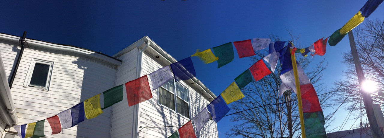 According to the dharma practice calendar (DPC) , today was/is an auspicious day…one of the most, in fact and an excellent day for hanging prayer flags. So that’s what I did. We’d been wanting to change our prayer flags on our deck for a time but the weather/auspicious day/life schedule never seemed to line up. The idea crossed my mind yesterday but when I consulted the DPC, it wasn’t a good day so I made the commitment to do it today.