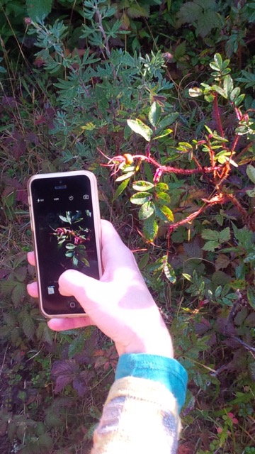 Smart phones made it easy to capture the beauty of a rose hip in a hip way. Rose hips can be steeped into tea or made into jelly. Rose hips are a source of Vitamin C.