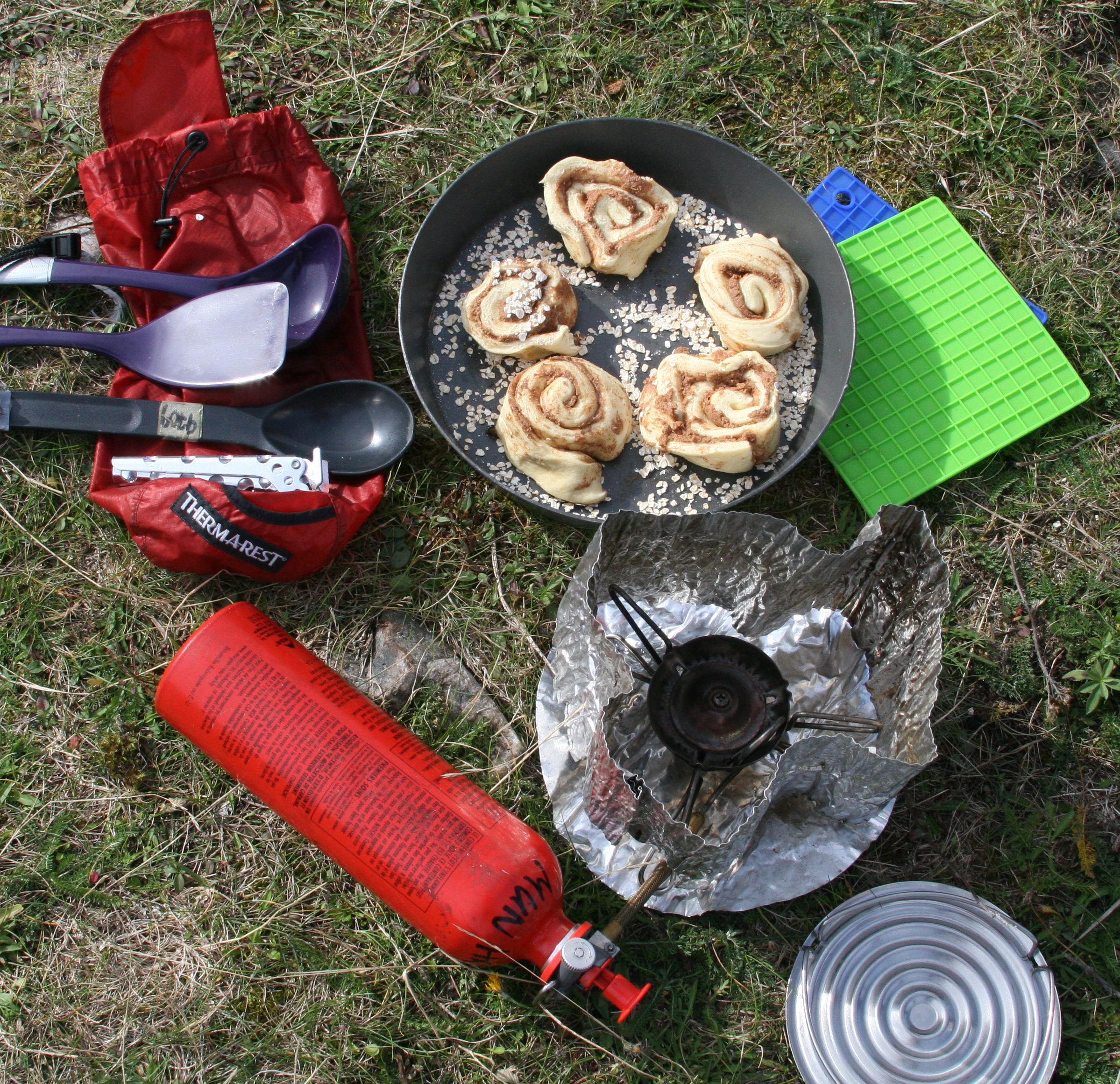 Here are our baking tools for today…Whisperlite MSR stove, Fry Bake pan, and flame-tamer complemented with silicon pot holders.