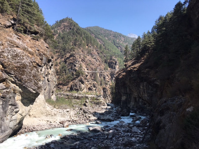As I hiked towards the Namche Hill (the first major hill of the trek), I contemplated the similarities between Newfoundlanders & Labradorians and Nepalis. I see great strength, resilience, and ability to overcome adversity. I see folks who live in harsh, remote locations looking out for each other and for guests. I feel at home in all. As I approached one of the most famous suspension bridges in Nepal at the foot of the Namche Hill, I decide I wanted to fly the Newfoundland and Labrador flag from the bridge celebrating my connection to both Nepal and Newfoundland and Labrador.