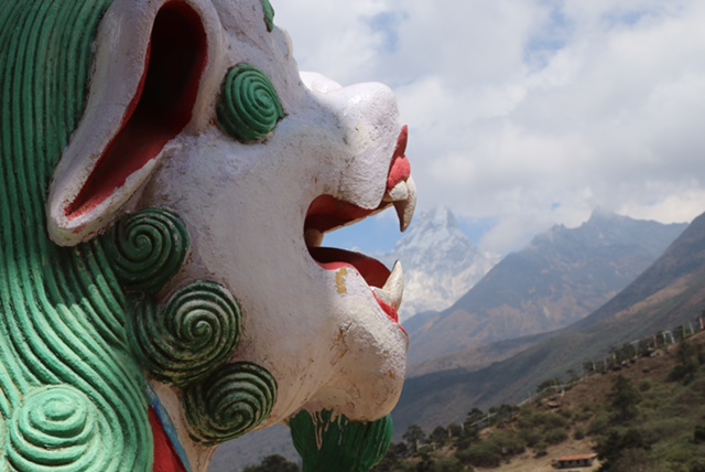 Finally, here is one of the Snow Lions guarding the entrance gate of Tengboche Monastery…it appears to be taking a small bite out of Ama Dablam.