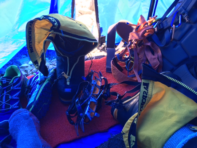 You’re looking down on our wonderful, comfy cozy base camp. My tent is the closest blue one you can see. Hugo and Dendi pioneered the use of bigger “tiny home” sized tents in 2012 and they are wonderful. They are roomy and you can stand-up in them. We can keep our wet climbing gear in the vestibule and the floor inside has insulation and carpet so it’s very posh living.