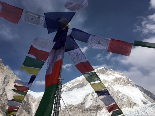 Prayer flags mark the entrance to the route through the Khumbu Icefall and they also mark the exit. Icefalls are areas on glaciers/mountains that breed fear into the hearts of mountaineers. They are avoided if possible but sometimes, the only route is through. We try to minimize the exposure to the falling ice dangers by moving as quickly as possible. For a first passage, through the Khumbu Icefall, it will take 6-8 hours. Sherpas do it much faster. This season, the government of Nepal allowed climbing teams to fly the rope and hardware for fixing the rope past camp two by helicopter to camp one. This reportedly saved 85 sherpa trips through the icefall. The 2014 tragedy where 16 sherpa were killed by an avalanche into the Khumbu icefall is fresh on everyone’s minds. The route is now more central to lessen the risk of such avalanches reaching the route. The route through the icefall is maintained by a group of sherpas called “The Icefall Doctors.” They are hired by the national park and each climber pays a fee to use the route.
