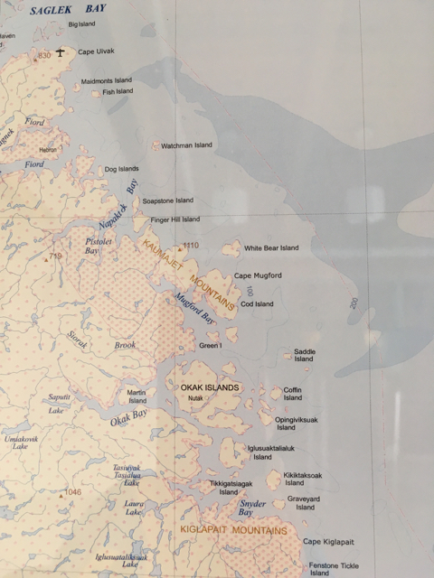 Our plan is to fly into Saglek airstrip, hopefully take a boat to Hebron Fiord, paddle to Grimmington Island, climb the Bishop’s Mitre and Brave Mountain, not get eaten by polar bears, and then paddle back to Saglek for our return flight to Goose Bay. As you can see on the map above, the Bishop’s Mitre and Brave Mountain are in the Kaumajet Mountains, a wonderful pocket range on the coast of Northern Labrador. You’ll also notice the likely aptly named White Bear Island. We hope none of the white bears are home. Grommington is the island to the east of Cod Island.
