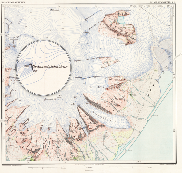 I found this map today from 1905. I’ve magnified the section of the map for Hvannadalshnúkur and you can see Vatnajökull Glacier represented by all the white on the map. There will be lots of snow and ice-but we’re hoping Öræfajökull Volcano stays quiet while we are there climbing. Interesting to note that Hvannadalshnúkur is 9 metres shorter than it used to be…It’s been remeasured…check out the story here.
