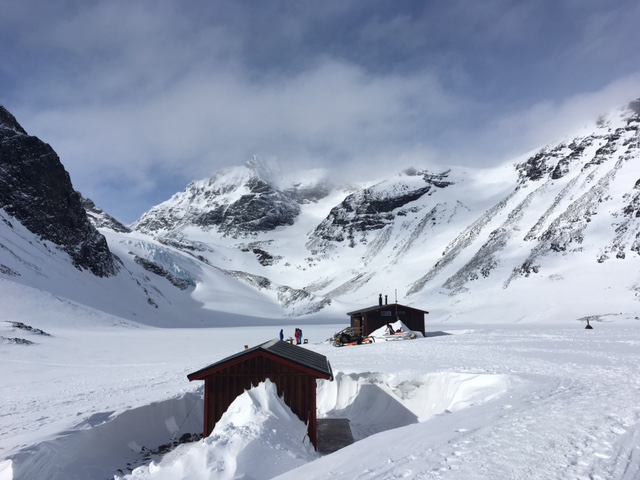 Marian and I got many views of ice and snow today, after the big good-byes. We skied 8 km into Tarfala. At Tarfala, we met Lars, the hut warden, who said Tarfala was the most beautiful hut in Sweden. Located below three different glaciers and beside a glacier fed lake, we had to agree.
