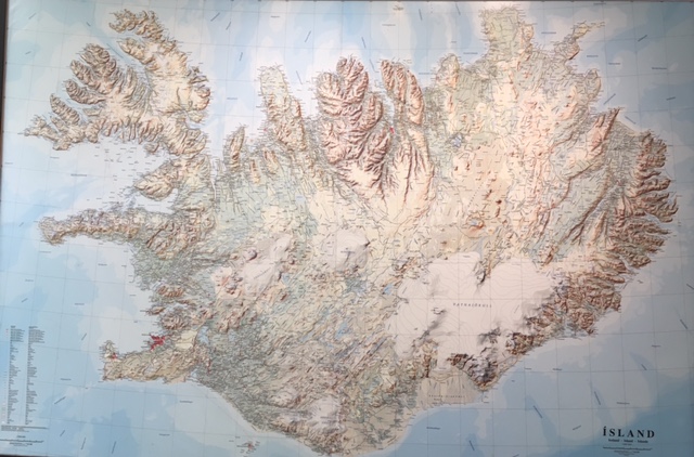 This is columnar basalt next to the black beach. All in all, the environs around Vik are quite stunning. Vik is the most southern town in Iceland. Can you find it on the map above? How about Iceland’s many ice caps~can you see them? Can you find a volcano? Or three? How about Iceland’s highest peak?