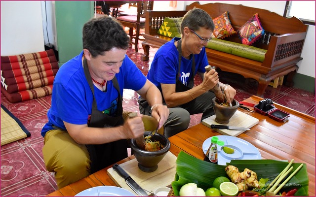 With this excellent start, Marian and I have been enjoying Thai street food every night and have made it our mission to try as many fruits that we can here. Thus far we’ve sampled jackfruit, snake fruit, passion fruit, dragon fruit, longans, pineapple, rose apples, jujube apples, bananas, guavas, sapodillas, ground cherries, strawberries, pomelos, mangoes, tamarind, tangerine, watermelon, custard apples and we have some egg fruit that we have to wait three days for it to ripen and we are on the hunt for just one bite of durian. We’ve eaten so much fruit we call ourselves “The Fruit Bats.” We signed up for a Thai cooking class and we were thrilled that it included a market tour so we could ask about several of the fruits as well as try some traditional Thai snacks. We learned to cook four Thai dishes and look forward to replicating them at home.