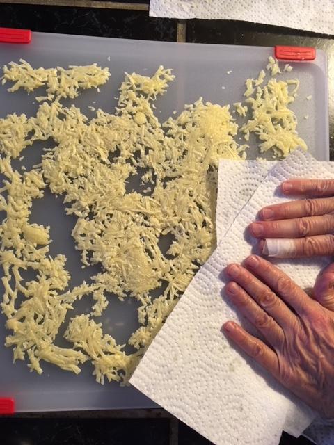 You can dry entire meals (like chili or shepherd’s pie. You can dry individual foods like bananas or broccoli, oh my. You can dry meat or fish, chicken or tofu. You can even dry eggs and ham! You are limited only by your imagination, your time for trip prep, and a few technical challenges (i.e. it can be difficult to dry fattier foods). The picture below is Marian blotting fat off cheddar cheese we were drying.