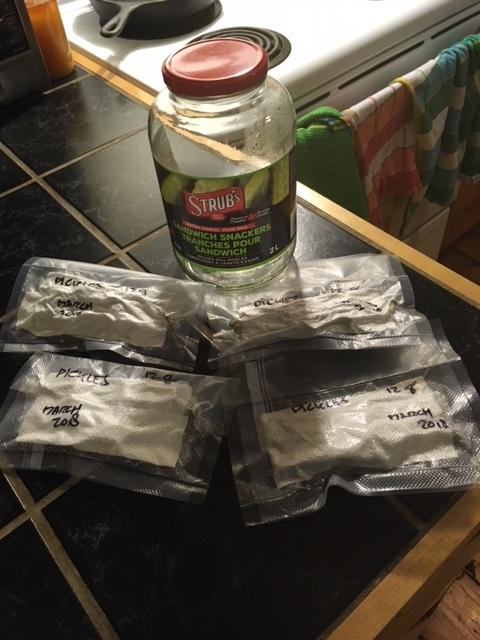 Yes, it is possible to dry fish (it’s been done for centuries). For long trips, I will often dry some tuna for use in the last few days of a trip. No matter what you are drying, dry it well. The longer you need to store it, the dryer it needs to be. Our trip is a few months away yet, so we made everything very, very dry and then vacuum sealed it all to keep air and moisture out. For trips just a few days out, I leave a little chew in my fruit and berries. Some food gets very sharp when it is dried, making it a challenge to keep it from poking through the vacuum seal bags and thus breaking the seal. We’ve taken to wrapping prickly dry foods in paper towels to prevent this-the bonus is that you get a piece of fire starter to use or a quicker picker upper to give those camp pots a wipe. In the picture below, you can see the volume savings of drying a 2L jar of pickles and the paper towel vacuum seal trip because indeed, we packed a peck of prickly pickles.