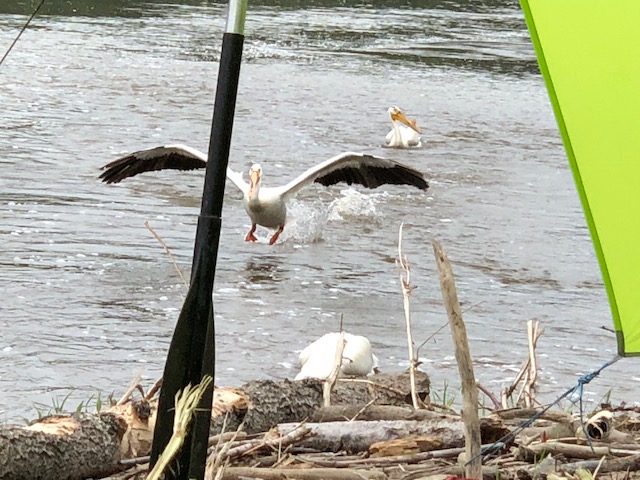 We were awoken last night by a strange sound. We we look outside the tent six white apparitions were floating down the river. At first we couldn’t make sense of the shape. I was relieved when I remembered we were too far south for them to be polar bears. My brain worked hard to pattern match and I realized they were pelicans. We watched them feed in “Lily Creek” for about an hour then went back to sleep. They were still here when we woke in the morning and we watched them feed and preen some more until our tummies stared growling and we spooked them when we got up. They hung out for awhile but eventually floated down river to their next meal. It was magical to have such a close up view of them.