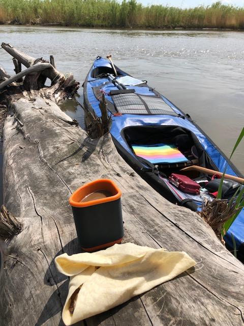 We had a wicked cool lunch spot today. The picture doesn’t do it justice. The end of the log was floating and I got to climb out of the canoe, with lunch in hand, up the tree. It was the only spot we could find as we paddled out Maeawi Creek to Mawawi Lake. As we are in the Athabasca River Delta, things are ever changing and maps just can’t keep up. Fortunately, we had satellite imagery to assist us because the map showed the creek ending at the lake’s edge when in reality, the channel reached out 5 km into the lake. It turned out to be very handy that it did as the wind was kicking up a bit and the extended version of the creek cut the open crossing down considerably.