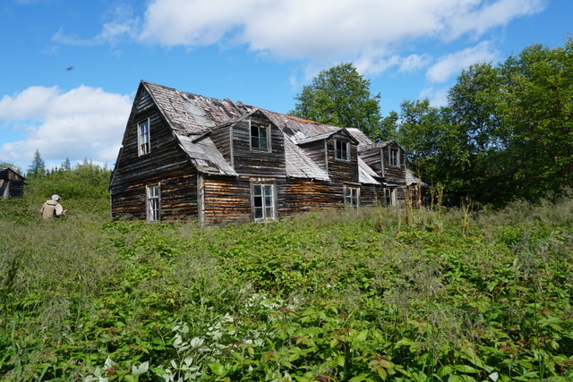 We chatted about our trip and asked a few questions about the route ahead. We were relieved to hear that the polar bears were out on the outer islands during this time of year so it was unlikely that we would meet one on our way to Hopedale. There are two buildings that instantly catch your attention in Adlatok, both from the 1860’s and both built the great-great-grandfather of the man on the porch. They said it was fine to visit them after lunch, but warned us to “watch out for a three-legged bear – we saw one as we boated in this morning.” We had lunch and made our way through the tall grasses and raspberry canes to admire the construction methods that had kept the buildings standing for such a long time. No three-legged bears here, however!
