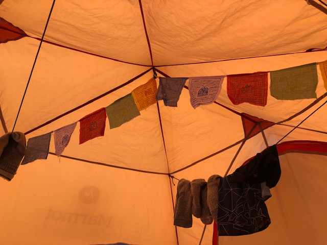 We climbed to Yala Peak high camp (4800 metres) from Khanjin Gompa (after acclimating there for a day and climbing to Little Khanjin Ri at 4300 metres.) We might have climbed higher to the top of Khanjin Ri (4700 metres) but the clouds rolled in and took away the view. The pull to Yala Peak high camp took about 5 hours. It was a contouring up with some steep sections thrown in for character development.