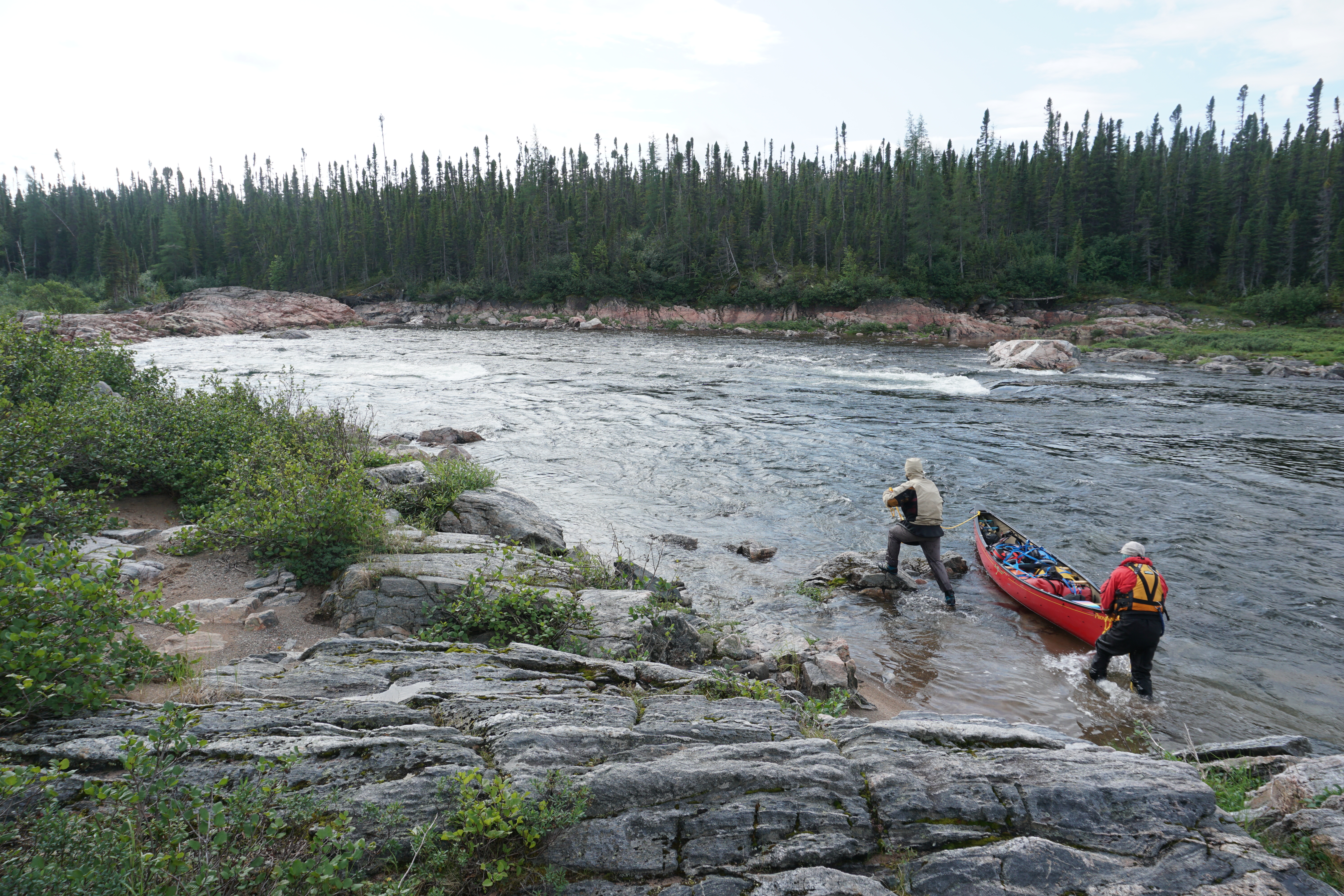 Lining the canoe around the first rapid