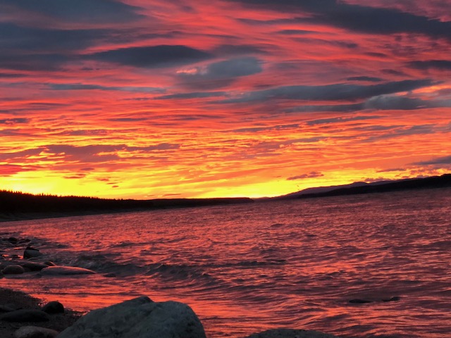 We closed our day watching a most gorgeous sunset over Groswater bay and the sky was striated with clouds and the sea was reflective and we were sitting on some rocks.