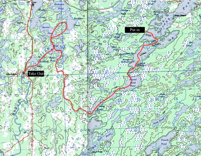 In July, we paddled a route that was new to all three of us. We began in Ocean Pond and then used the Hodges River to transition over to the Whitborne pond Circuit and then we finished by taking the Hodges River out to the Markland Bridge. We camped overnight at Third pond, explored Third and Second Ponds extensively and then headed to our take-out (we’d shuttled one car to the Markland Bridge). The route needs a fair amount of water (we had 30 m/s on the Rocky River gauge) from recent heavy rains. South of Long Pond, there are a few ledges to lift over (we did so on the left) and one waterfall to portage around (we did so on the left). Other than those areas to be aware of, it was a delightful run but for early spring runs keep an eye out for snags or sweepers.